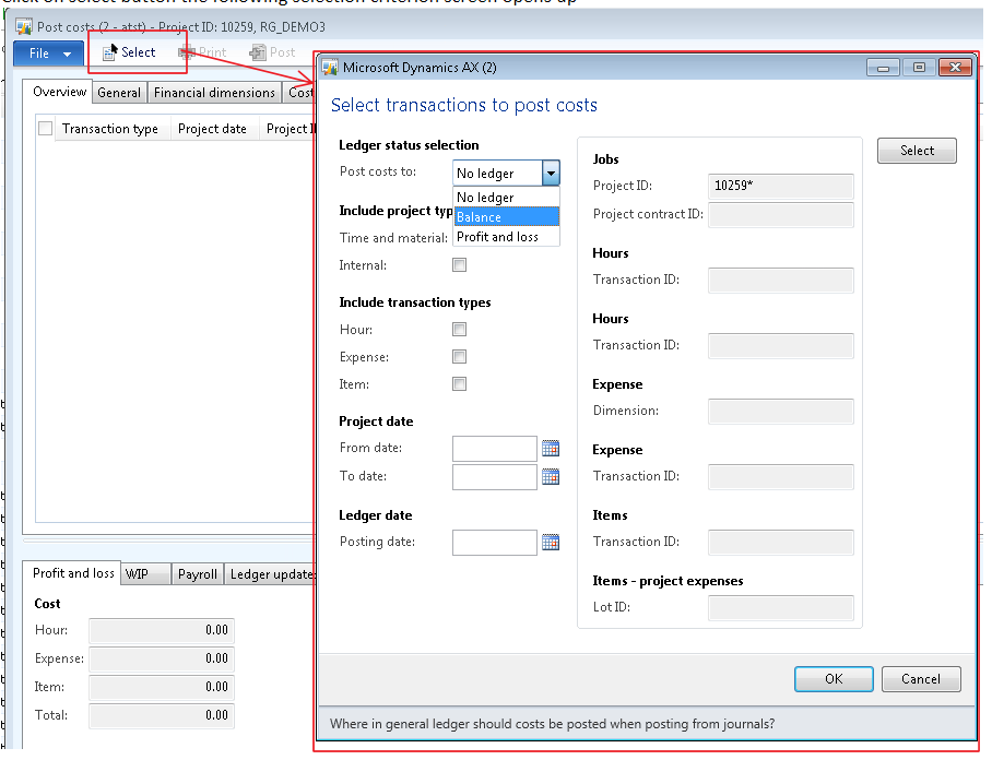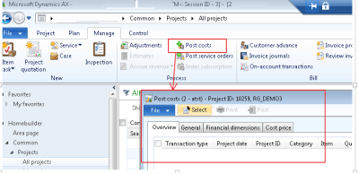 Step 3 – Post: User fills the selection criterion and click OK, system generates some records based on this selection and those records are shown in the post cost screen as shown below and then user posts the cost and these can be seen in posted transactions of the project.