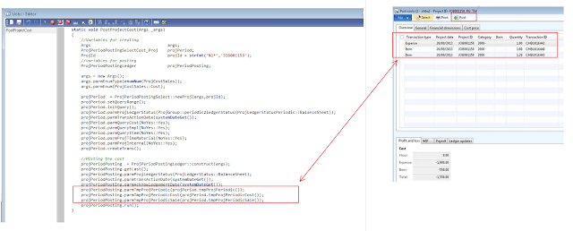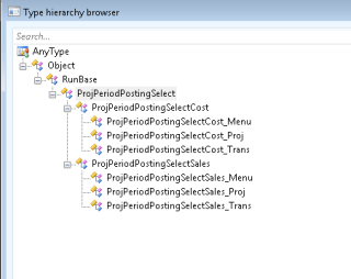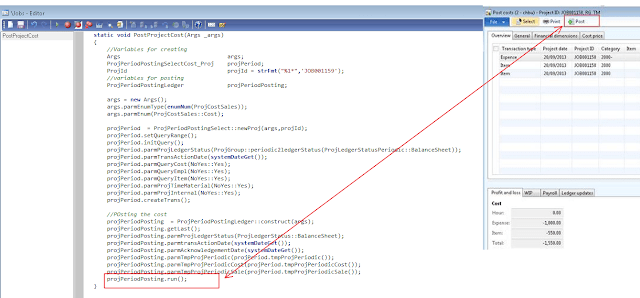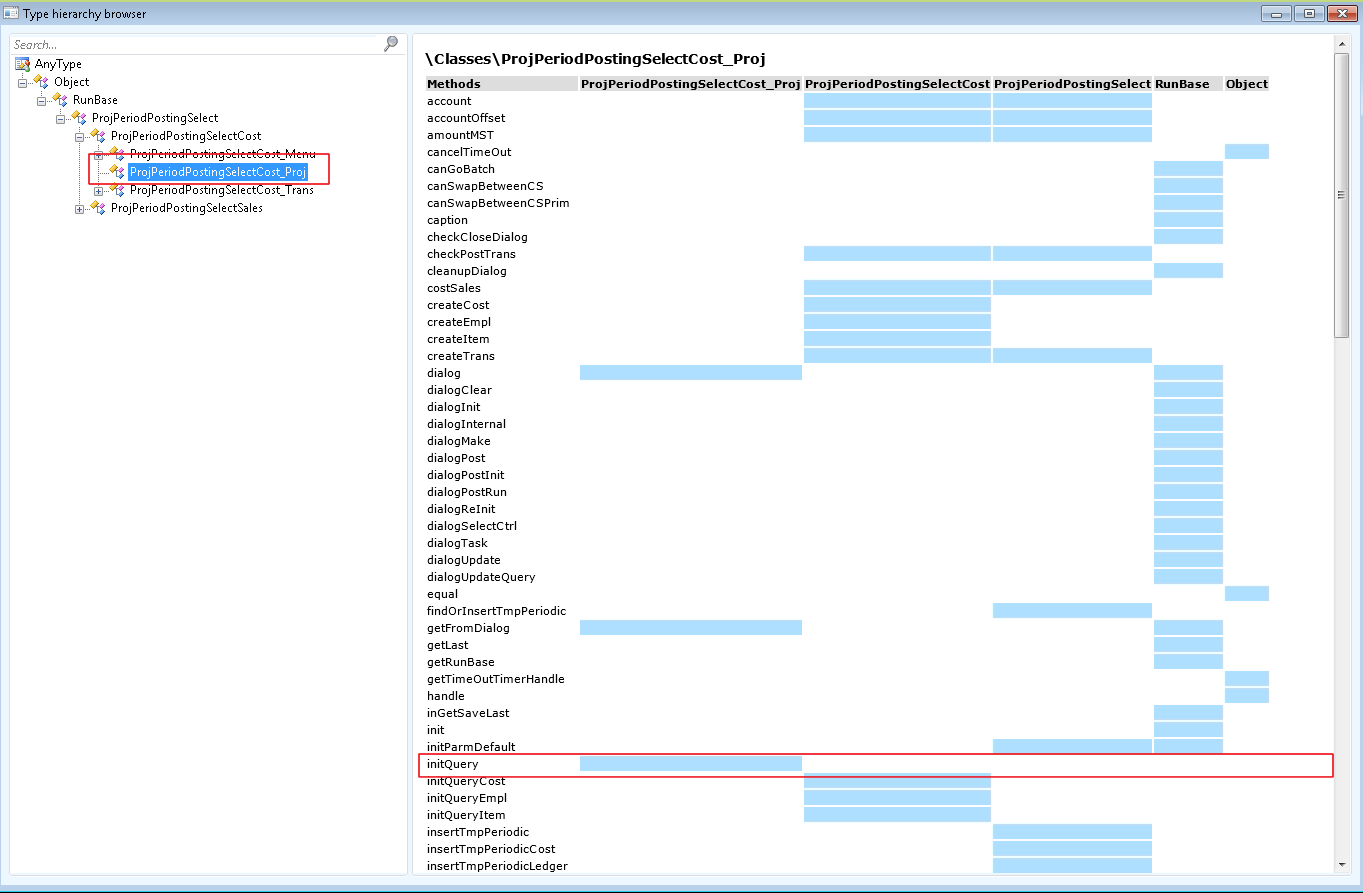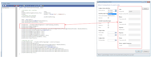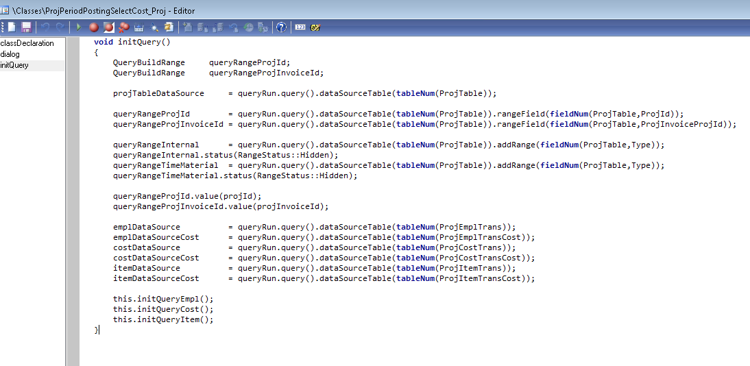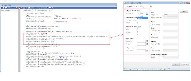 U might notice that I have declared object of ProjPeriodPostingSelectCost_Proj class instead of ProjPeriodPostingSelectCost and the reason for this is I need to initialize query for the project. If you debug the standard AX class then you will notice that the function to initialize it for a project is called from the dialog() method of class \”ProjPeriodPostingSelectCost_Proj \”