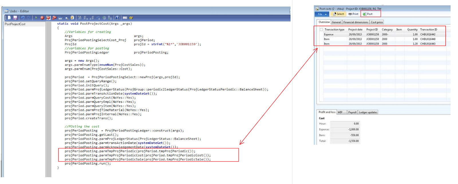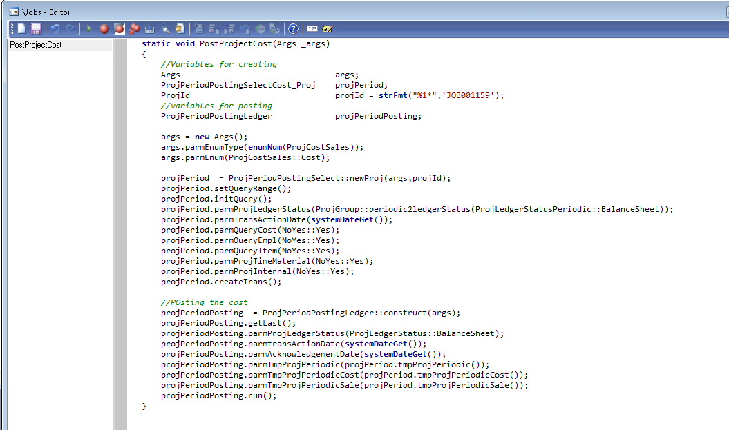 ProjId projId = strFmt(\”%1*\”,\’JOB001159\’); //Your project Number