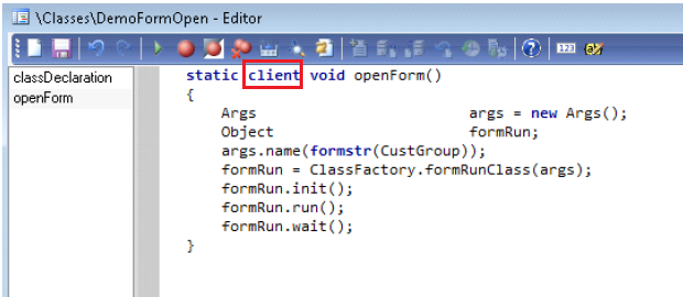 - Now let\’s use classFactory to run the form and again change the function declaration to run the function on client