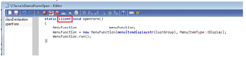 - Create a new class and a static function which always runs on a client. Inside this function we are creating an instance of MenuFunction class to run the display menu item \”CustGroup\”
