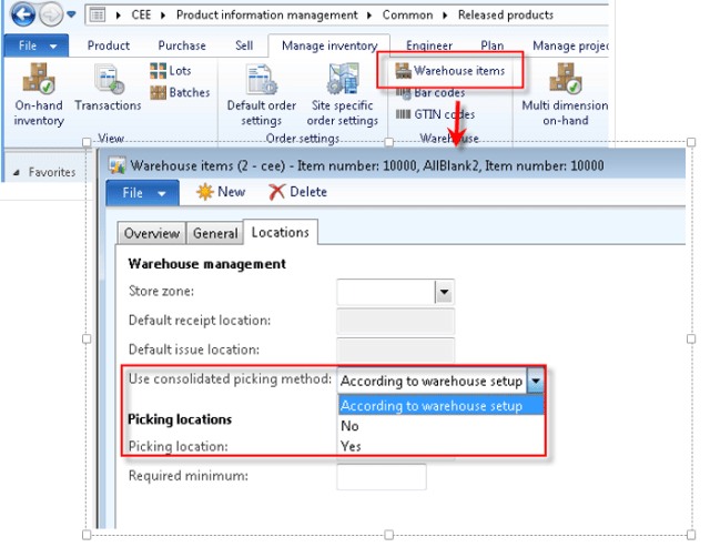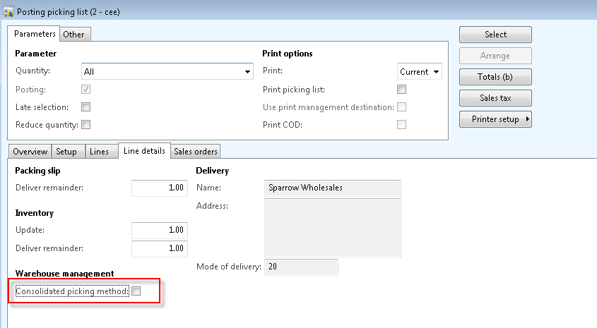 2. If the setup on warehouse items is \”According to warehouse setup\” then system checks the picking method defined on warehouse used in sales line: