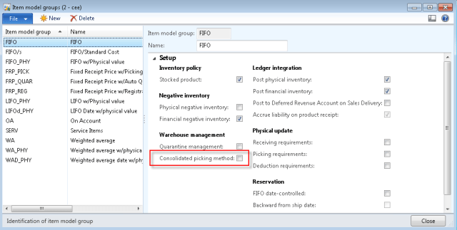 3. If the picking method defined on warehouse of \”According to model group\” then system checks the value of field \”Consolidated picking method\” on the model group defined on item: