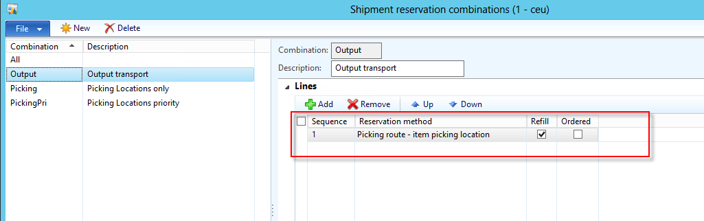 To keep it simple, I have defined the shipment reservation sequence to look only for item picking locations and have turned on the refill parameter as shown below: