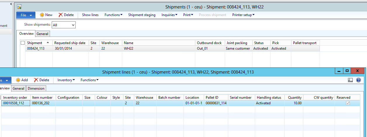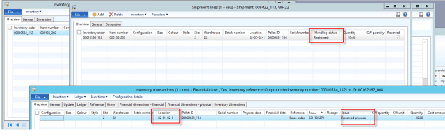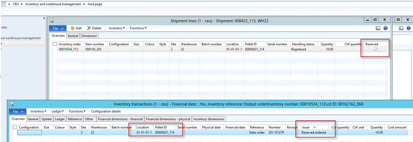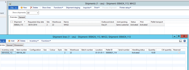 Notice that the shipment status is registered but the reserved check box is turned on.