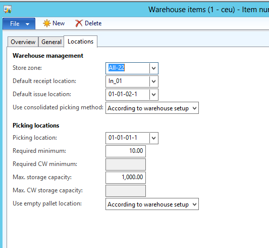 First let\’s look at the setup and the current system situation. The current warehouse item setup for the item I will be using is as shown below
