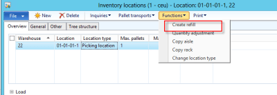User can also create refills manually, directly from the location form, but this button is enabled only for the locations of type picking. The system uses same algorithm to check and create a refill pallet transport when it creates automatically or manually. Interested readers who want to read the code can check out the \\Classes\\WMSPickingLocationRefillCheck\\checkAndRefill() function to understand more on the logic behind it.