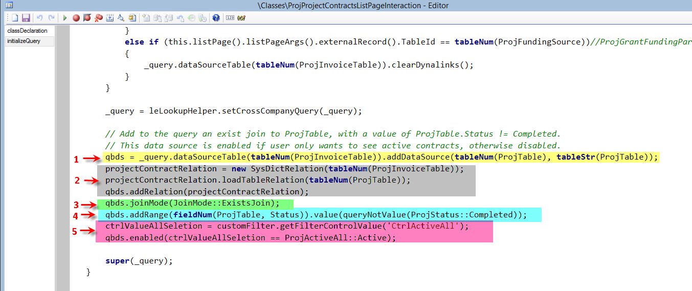 The above code is a good example to understand how we can add relations and use exists join in query data sources. This approach is also helpful if we need to do a similar customization.