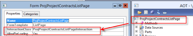 4. So now things become interesting! When is the data source \”ProjTable\” added in the query? To find this, let\’s check out the interaction class used in the list page. Interaction class name can be checked from the property of the list page: