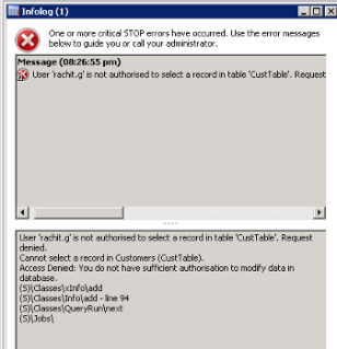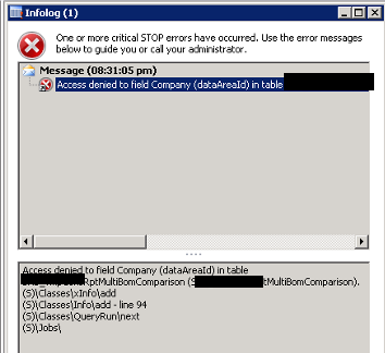 • SSRS error 2 – \” Access denied to field Company (dataAreaId) in table\”.