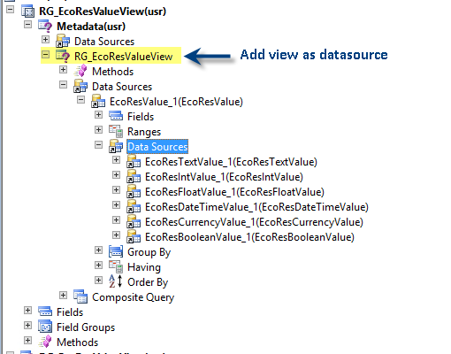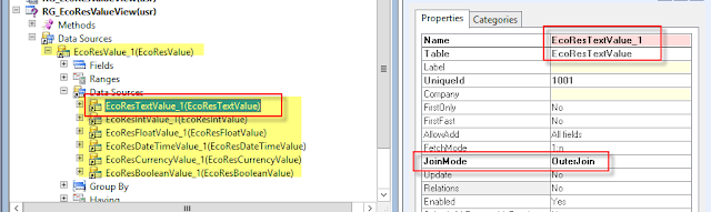 To do this we need to first model a query having all the above dataSources linked to parent table. So the root table will be EcoResValue and then all the other tables with the link type of outer join.