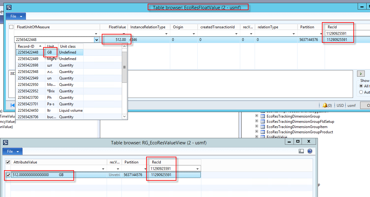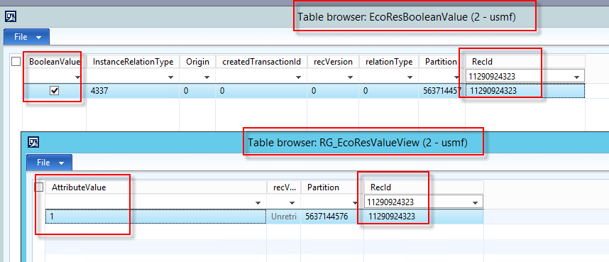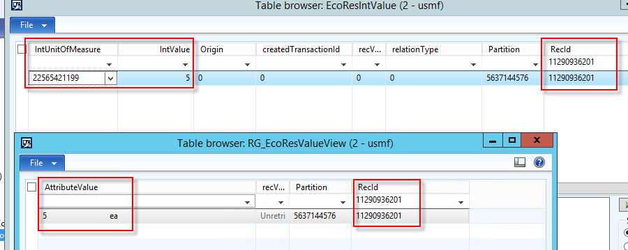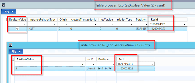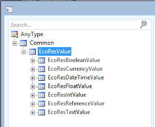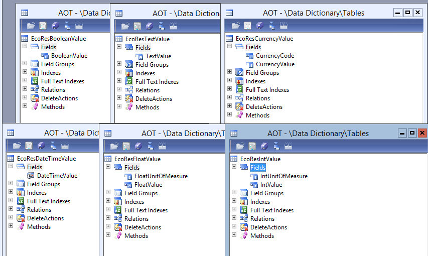 In standard AX we can create/define product attributes applicable on a product. Technically the attributes data is stored in a set of tables which use table inheritance. EcoResValue is the parent table of these tables as shown below: