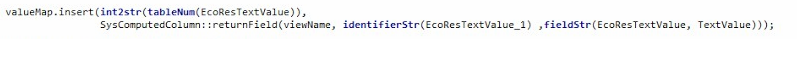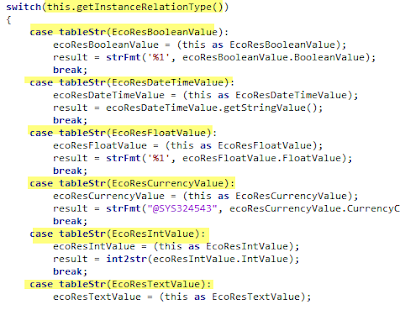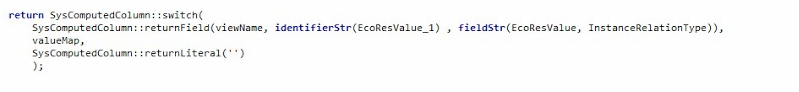 There is a standard AX display method [\\Data Dictionary\\Tables\\EcoResValue\\Methods\\getValueAsText()] which fetches the value from the respective child table. We will actually be simulating the same in our computed column code. In this method, switch is on the basis of InstanceRelationType and case on tableId. Value is returned from that respective table: