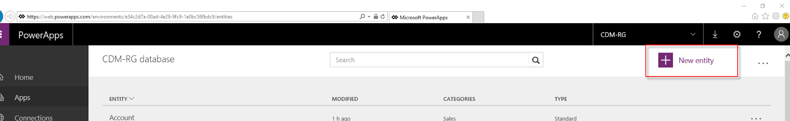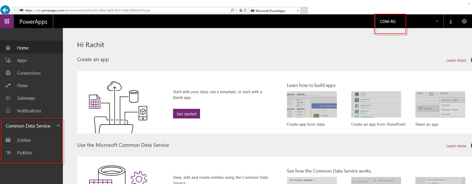 When you login to powerapps portal you will need to first create a new environment to access the CDM entities. To know more about environment refer to working with environments .