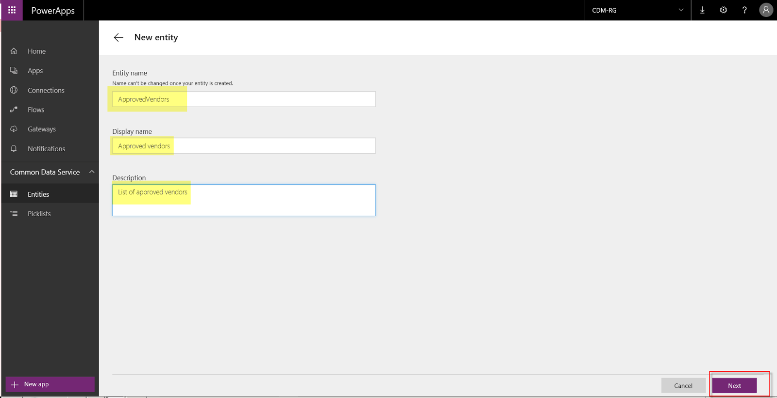 To create a new entity click on \”New entity\” button and give it a name. Let\’s call it \”Approved vendors\” and enter a description and click next. You will observe it is a very nice self guided experience.