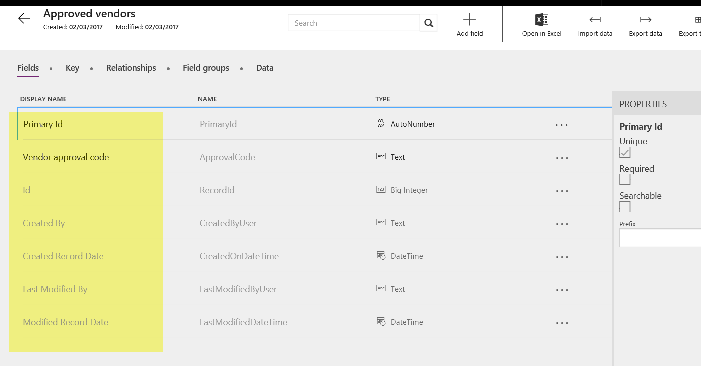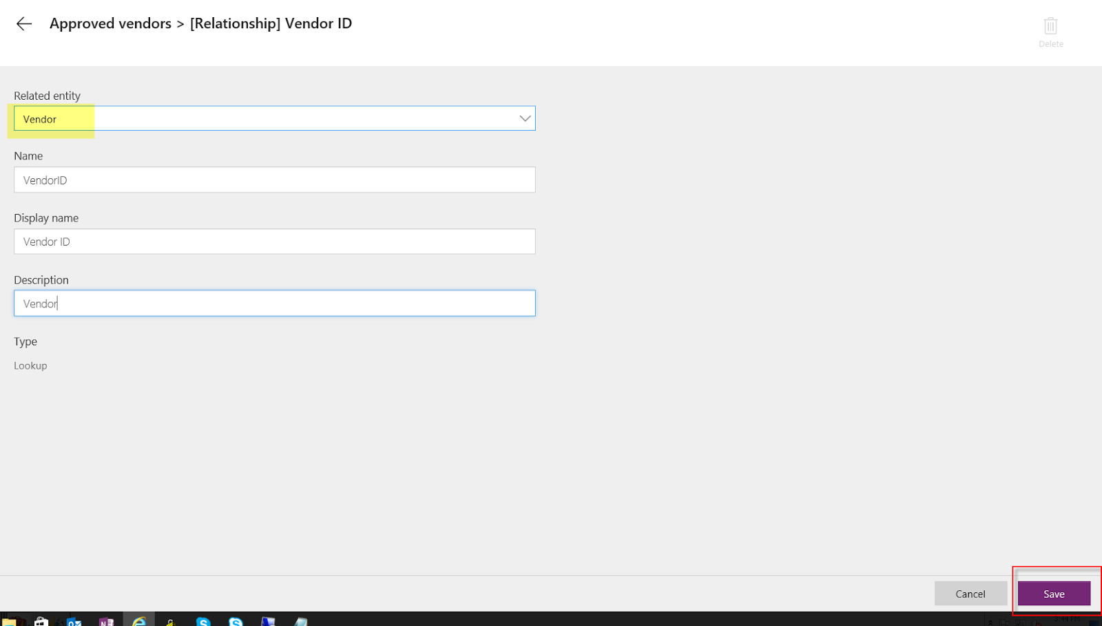 Now you can see that the vendor ID is visible on the entity fields. The type of this field is a lookup due to the relationship created for it.