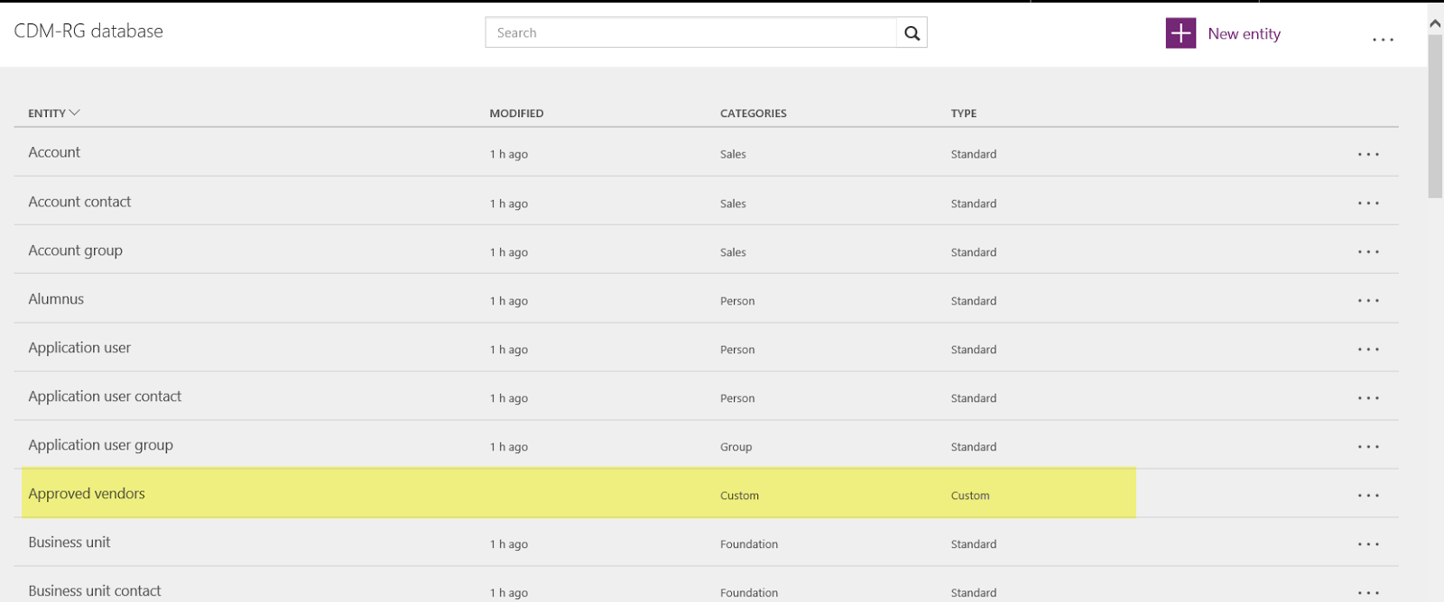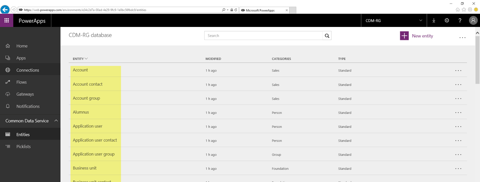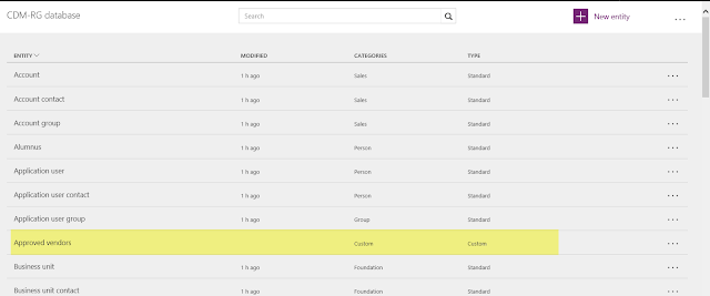 Now we can view the available entities from the Entities button on the left hand pane . CDM ships around 60+ entities. The details of all the entities and there relationship can be found in the whitepaper available at CDMEntityReference document