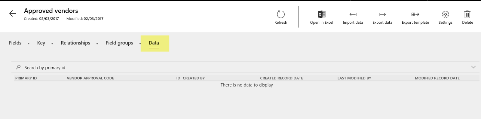 At this stage as we have only created the entity schema, there is no data in the entity. This can be seen from the \”Data\” group as shown below