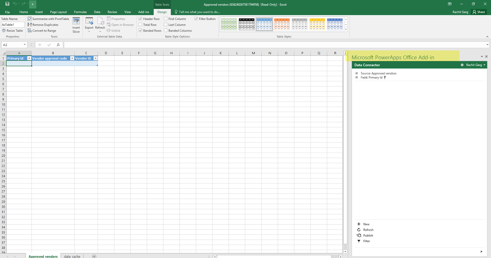 Now we can open this entity in excel by clicking on the \”open in excel\” button. The powerapp office add-in will also load.