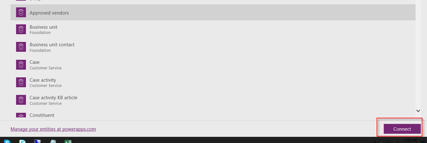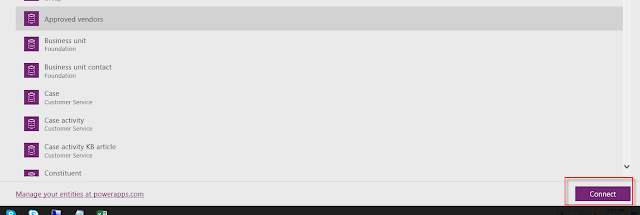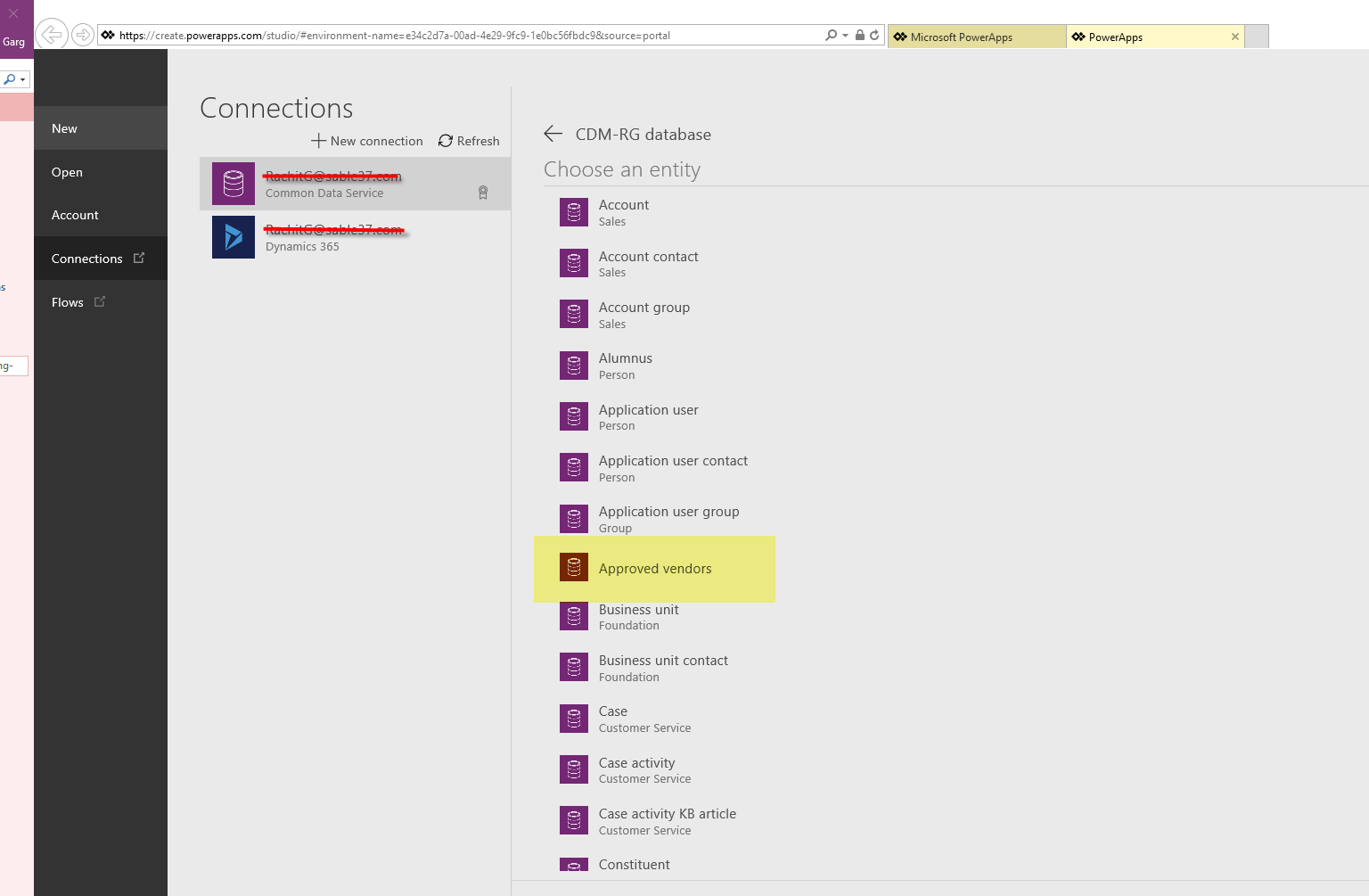 You will land on the connections page. Here we can see the CDM database we created in previous post. Once you select the CDM DB then you can see the desired entity . Notice we can see our custom \”Approved vendors\” entity