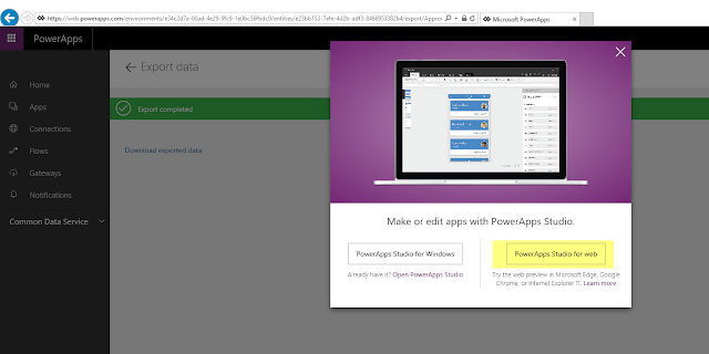 Select if you want to use the powerapps studio for windows or the powerapps studio for web to create the new app. In this example I choose Powerapp studio for Web