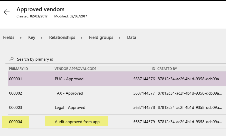 We can go back to CDM database and view the data of the entity. The new records we created from the App is visible here.