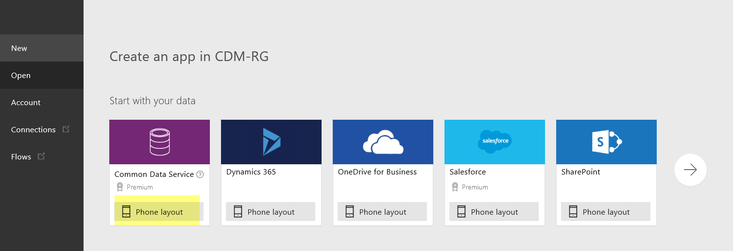 Microsoft provides out of the box templates for creating apps. Let\’s create a simple phone layout app for connecting to CDM database via Common Data Service