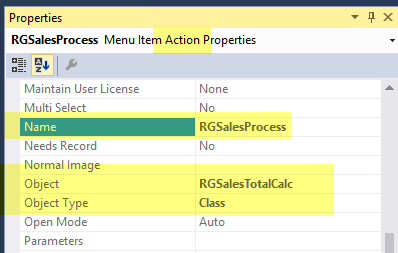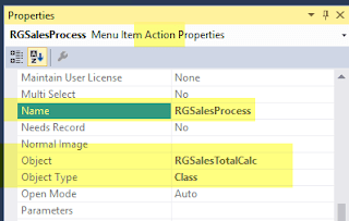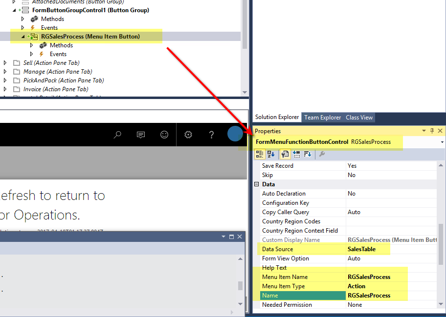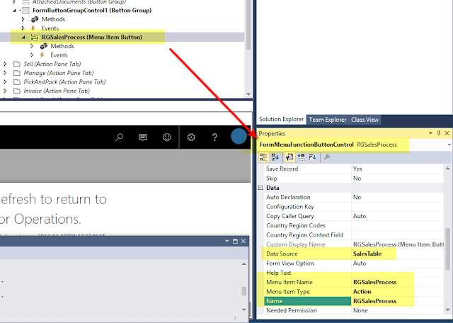 Verify that the menu item button is having correct properties and define the data source property as SalesTable