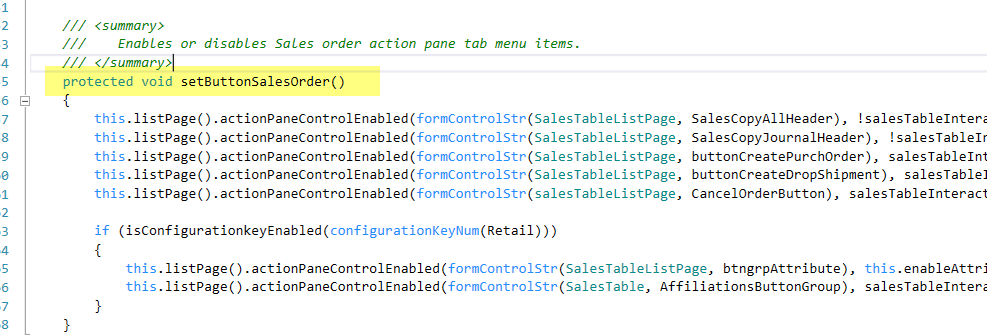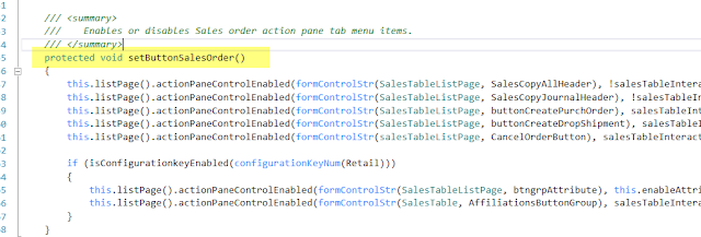 As we added the button in the sales order action pane group we can see that there is a method in this class which used to set buttons on the sales order action pane tab menu items . Notice that this is a protected method.