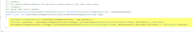 Now let\’s add more logic to our button to only be enabled for sales orders which are not invoiced. Typically we would go to the interaction class and modify the function which is enabling/disabling button, but we want to do this without customizing the standard class and with the use of extensions.