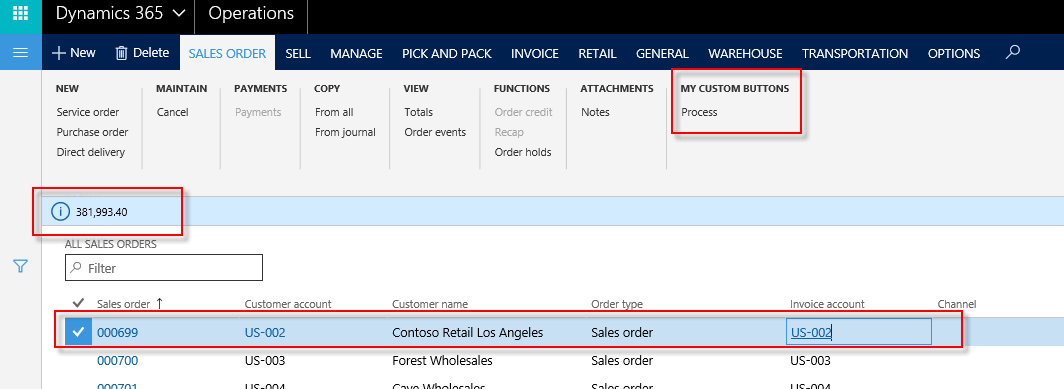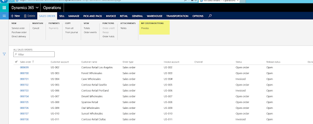 Build the project and test the button. When you open the sales table list page the new button is visible
