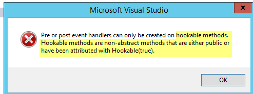 You will be greeted with the below error message. We can only create event handlers for Hookable methods. The definition of Hookable method is also shown in the error message, these are non-abstract methods that are either public or tagged with the \”Hookable\” attribute as true.