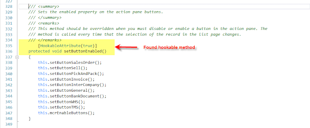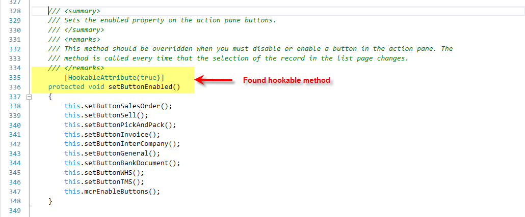 Let\’s find a hookable method in the interaction class: On a quick scan in the class you can see that the setButtonEnabled() method is a protected method and decorated with the \”HookableAttribute\” as true.