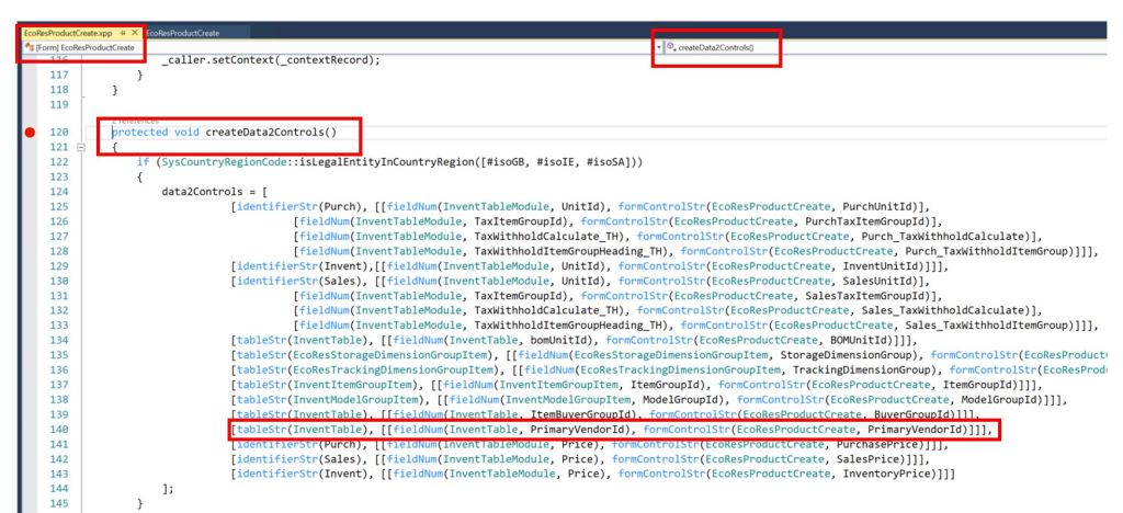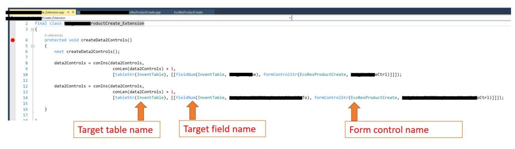- In the new class , extend the method createdata2Controls() to add the mapping of your new fields on the table extension with the form unbounded controls . Below is the sample