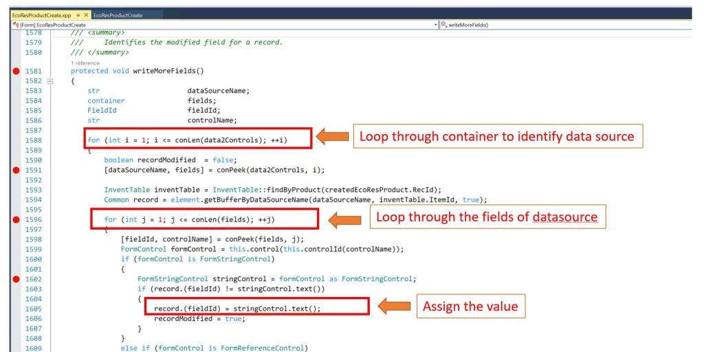 - Create extension of the EcoresProductCreate form and add unbounded controls on the form design. Set Auto declaration as True.