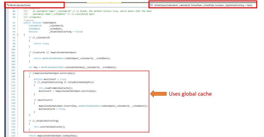 Instead of writing your own X++ SQL statement to understand table relations and loop through work calendar setup lines, there is a standard class which has this method built in and we can call it to find if a particular day is open in calendar or not.