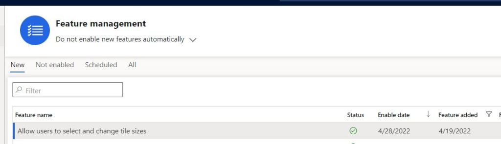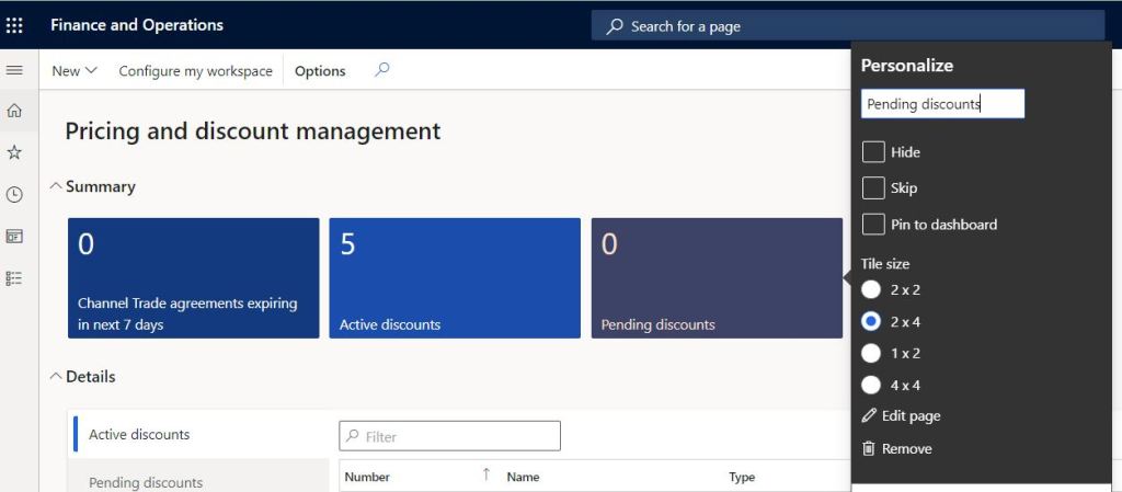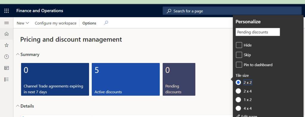 In Dynamics 365 F&O service update 10.0.26, a new personalization feature is released which allows users to choose and select desired tile size for the workspaces. The feature can be enabled from Feature management workspace
