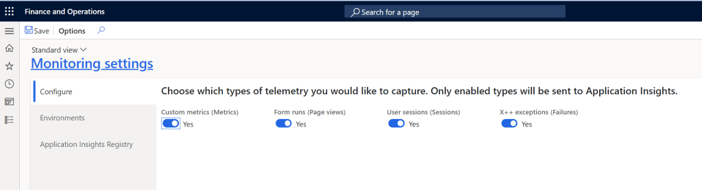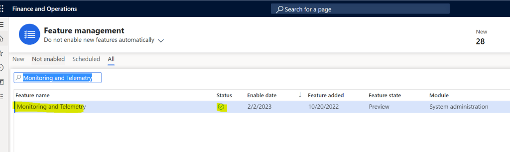 - Now open the Dynamics 365 F&O feature management workspace and enable the feature named “Monitoring and Telemetery”