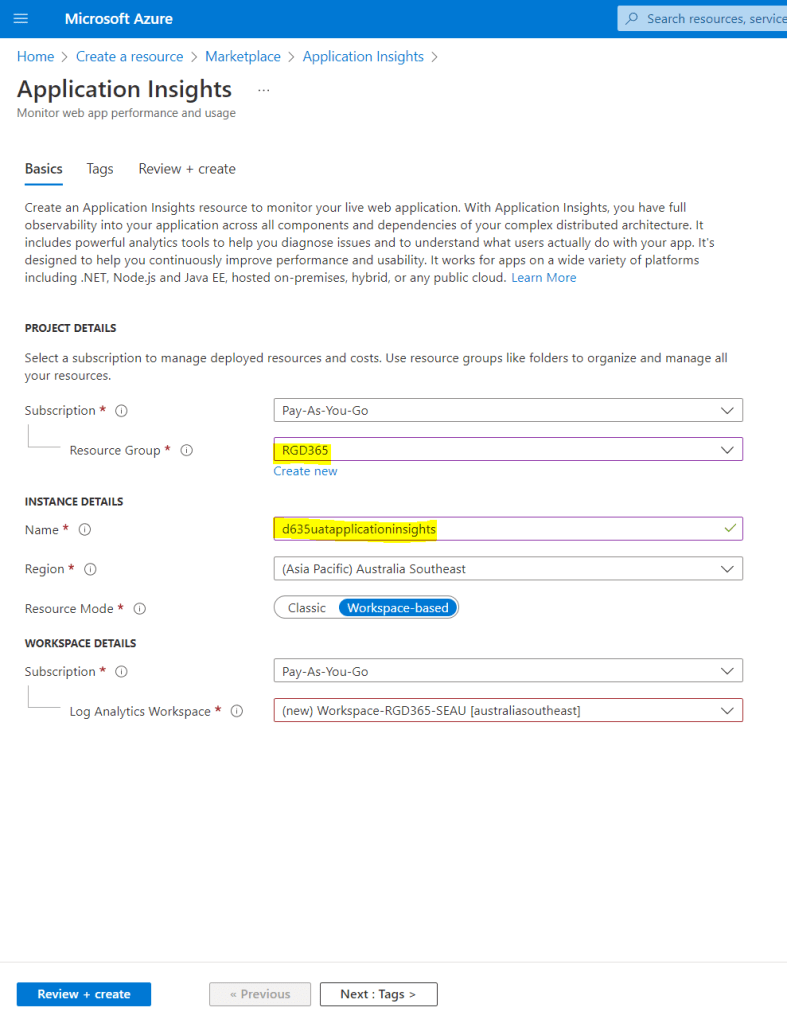 - On the third tab we have to define the mode and link it with the instrumentation key which we copied from the azure portal after creating the rescource.