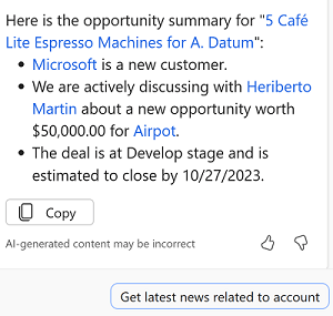Copilot can get the latest news that features or mentions your accounts, curated by Bing. These news articles can be great conversation starters and help you understand the dynamics in your customers’ organizations.