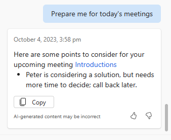 If you have meetings scheduled on your calendar in the next 24 hours, Copilot can help you prepare for them. Go into your meetings with a helpful summary of notes from the last three months and the most recent email thread on the timeline of the related record.